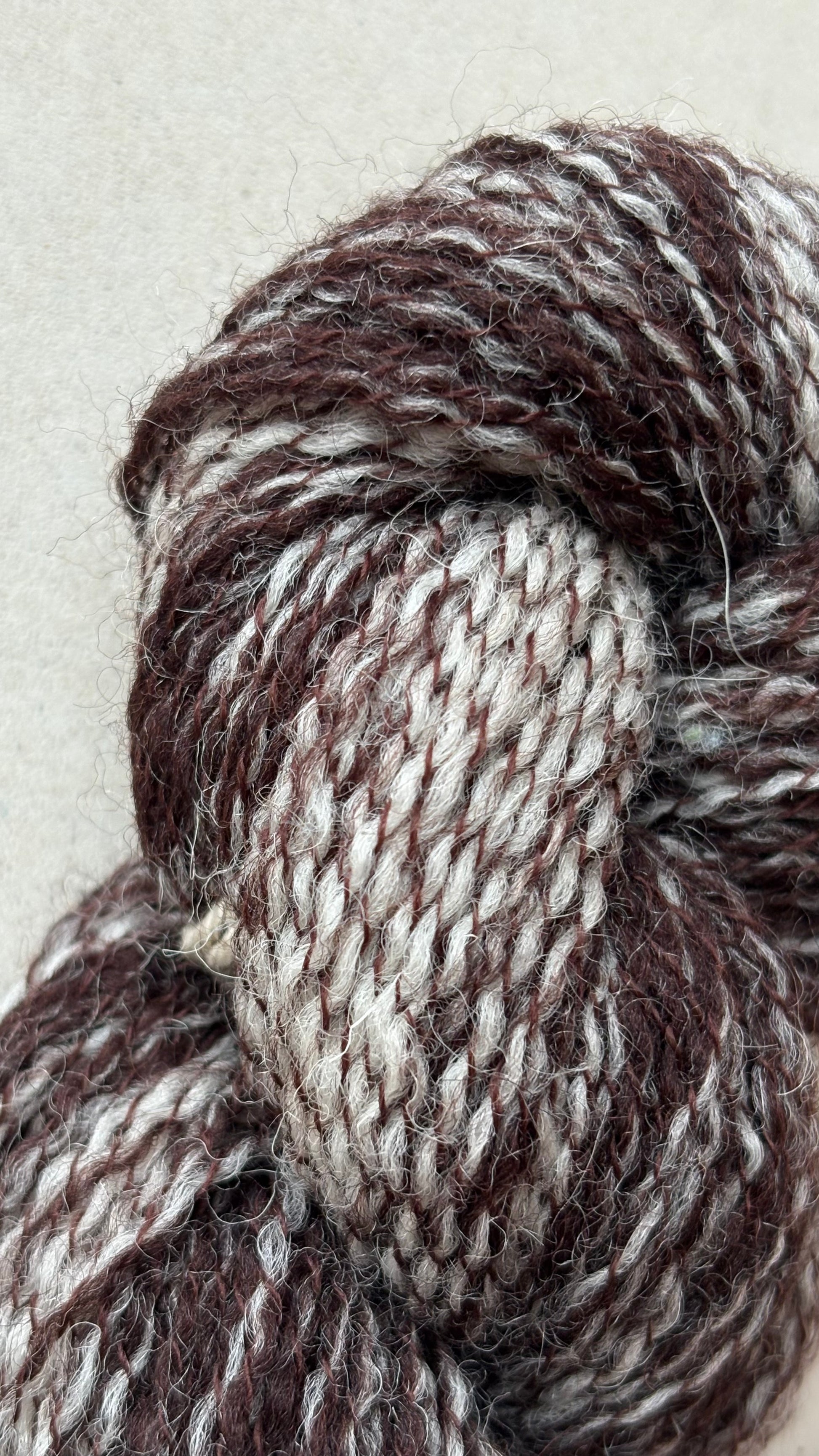 A beautiful, unique, undyed, hand-spun Moorit Jacob yarn in its Deep Moorit Heather shade.