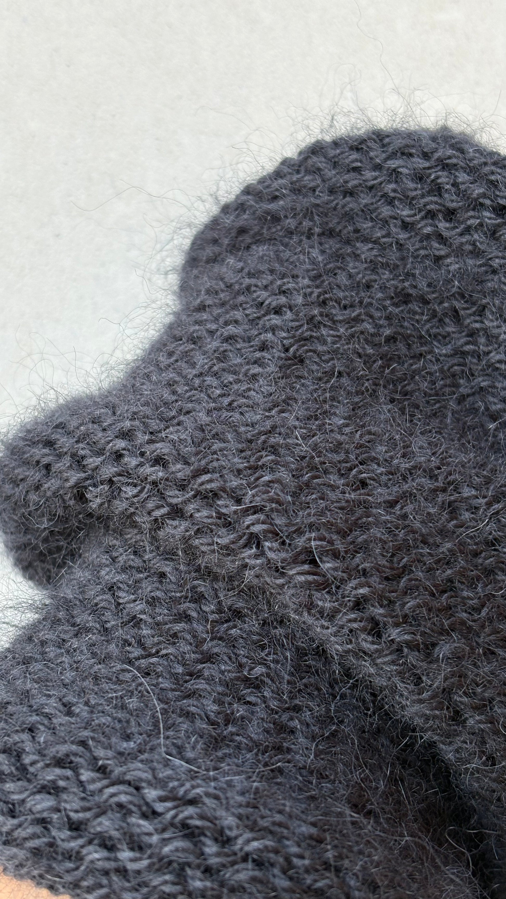 The yarn may stretch slightly with wear, and the wool will soften and improve with age. Hand wash and dry flat.